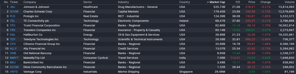 Today will see a wide variety of regional banks reporting, both in the premarket and aftermarket session. However, this morning's biggest reports will come from health care giant Johnson & Johnson, brokerage Charles Schwab, and REIT Prologis, among others: